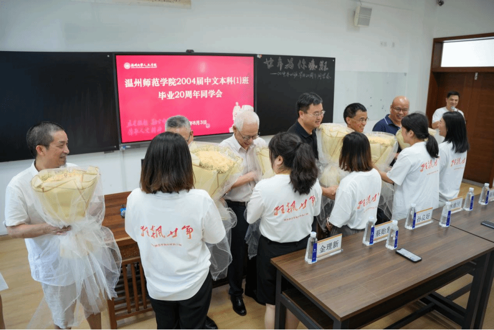 主题班会精心设置了重温课堂环节,骆锤炼老师为同学们献上了饱含深情的《当时我们选择了这座城市》;俞磊老师分享了自己多年的写作教学体会与经验;金理新老师殷殷叮嘱大家要注重阶段和过程;蔡贻象老师从同学们身着的文化衫上的标语“狂飚廿年”切入,结合影视,为大家呈现了这20年的变与不变;林维民老师的诗歌课堂,深入浅出,看似刻板的经典名篇在他口中又生动鲜活了起来,同学们不约而同高诵《关雎》。书声朗朗,笑语晏晏,二十年后重温老师的课堂,那些青葱岁月的读书时光,不禁在大家的脑海里一一浮现。