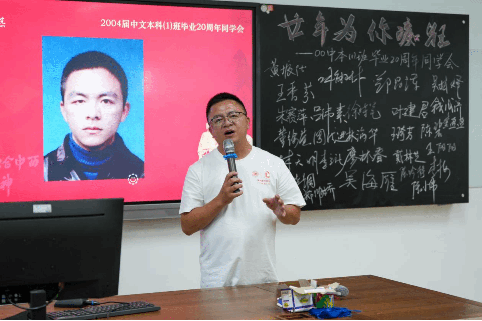 通过视频回溯了当年青春岁月之后,校友们按照曾经的学号依次上台,在20秒的时间内,向老师汇报自己的语文素养基本功,在黑板上一笔一划地写下自己的姓名,一句话介绍自己毕业后的工作经历,大家完美展现了自己扎实的师范技能及课堂把握的能力,老师们纷纷点头微笑以表赞许。