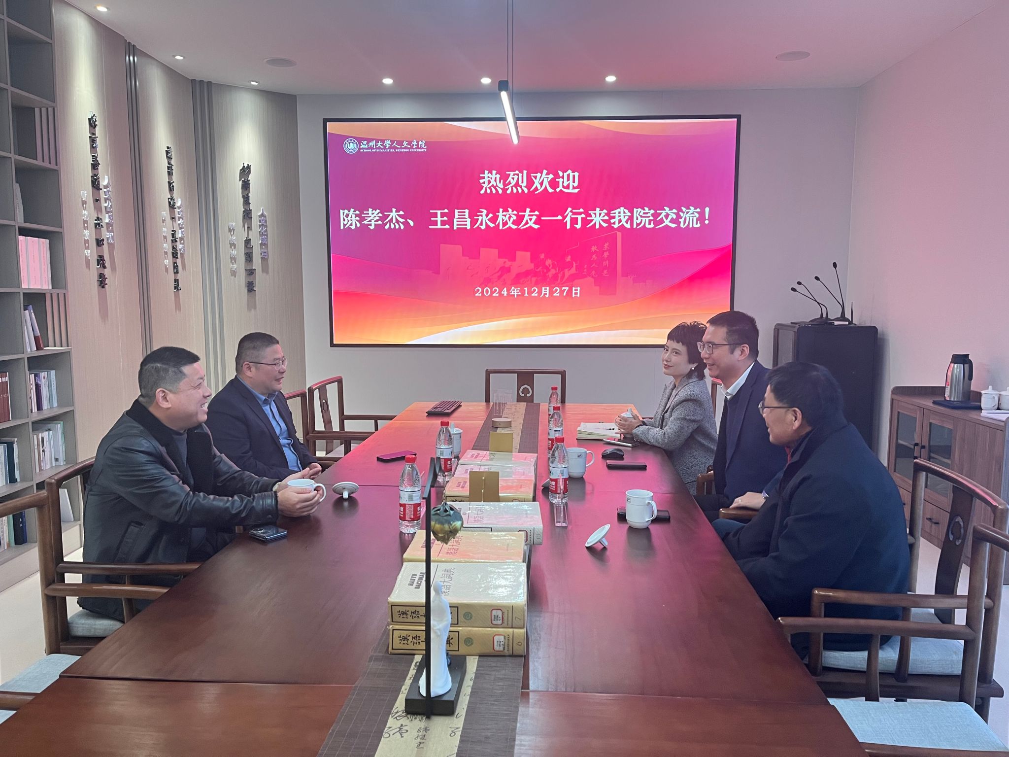 为了加强与校友的沟通交流,谋求教育领域的合作发展,2024年12月27日下午,温州万全教育集团董事长陈孝杰校友与副总裁王昌永校友来访九色視頻 ,院党委书记江秀景、院党委副书记黄玮与温州历史文化研究中心负责人刘建国陪同。